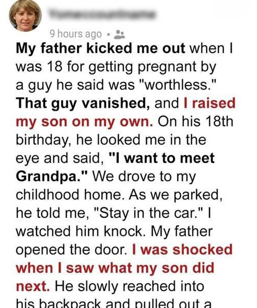 That guy vanished, and I raised my son on my own. On his 18th birthday, he looked me in the eye and said, “I want to meet Grandpa.” We drove to my childhood home.